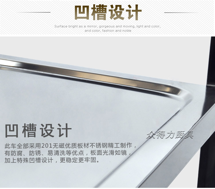 江西眾得力廚具有限公司生產(chǎn)銷售商用廚具,食品機械,提供中央廚房工程項目整體解決方案。不銹鋼餐車有大號、中號、小號,本公司生產(chǎn)銷售的不銹鋼餐車系列均采用201無磁不銹鋼材質(zhì),板材厚度足0.8mm,整機拆裝方便,結(jié)構(gòu)牢固,承重能力強。