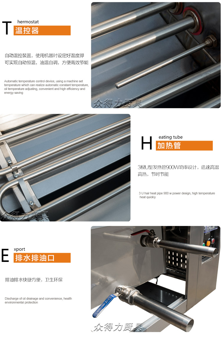 眾得力旗下產品油炸系列,不銹鋼電熱節能油水分離油炸爐,油炸機,YZ系列油炸爐,電加熱,節能油水分離油炸一體爐,油水過濾,確保油炸物能100%油炸,殘留物通過水過濾,拒絕一直油炸。油炸不變黑,炸出來的食品外形美觀