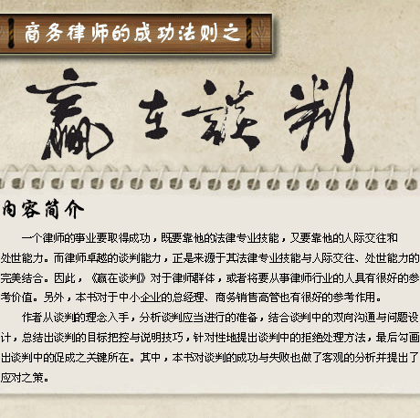 顯然,這是一部能夠讓律師同行有所收獲,使法律學(xué)子有所思考的實(shí)用之作。誠(chéng)如作者所說:“也許本書可以改變你幾天,如果改變這幾天你會(huì)得到快樂,這個(gè)改變就會(huì)延續(xù),并讓你成為最終的受益者?!庇纱丝梢姡緯且徊拷榻B律師了解商務(wù)談判、學(xué)習(xí)商務(wù)談判、參與商務(wù)談判、活用商務(wù)談判、提升商務(wù)談判技能、總結(jié)商務(wù)談判經(jīng)驗(yàn)、最后贏得商務(wù)談判、實(shí)現(xiàn)當(dāng)事人利益最大化的實(shí)用之作。