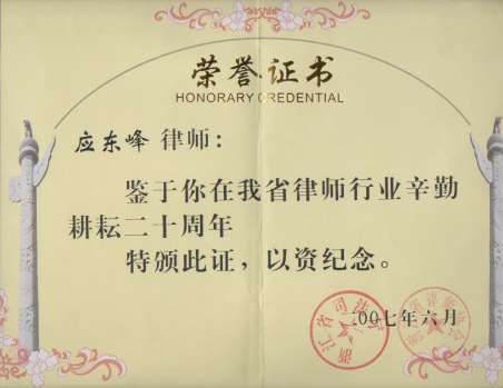 浙江省司法廳、省律協(xié)授予應(yīng)東峰律師“律師執(zhí)業(yè)二十年”榮譽(yù)證書和銀質(zhì)獎(jiǎng)?wù)?/p>