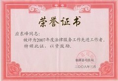 仙居司法局授予應(yīng)東峰律師法律服務(wù)先進(jìn)工作者榮譽(yù)證書