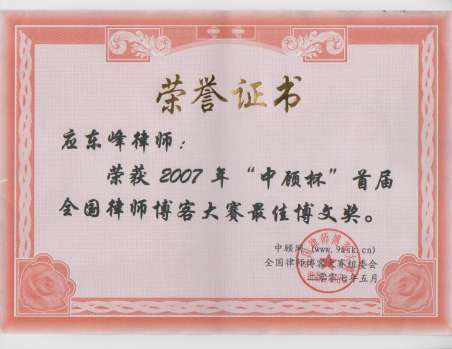 應(yīng)東峰律師獲首屆全國(guó)律師博客大賽最佳博客作品獎(jiǎng)
