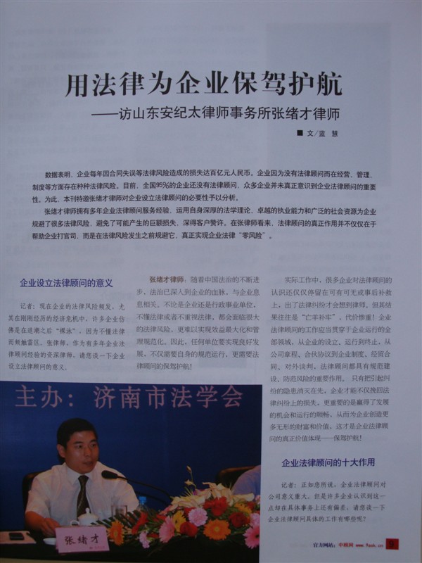 張緒才律師,山東緒才律師事務(wù)所主任、執(zhí)業(yè)律 師,具有嚴謹?shù)倪壿嬎季S能力和較高的法律職業(yè) 素養(yǎng),辦案實踐經(jīng)驗豐富,注重專業(yè)知識與辦案 技巧相結(jié)合。代理訴訟及仲裁案件數(shù)百件,擔(dān)任 十多家大型企業(yè)和行政事業(yè)單位常年法律顧問, 為當(dāng)事人維權(quán)案值累計過億元。先后多次榮獲“優(yōu) 秀律師”及多家專業(yè)網(wǎng)站“濟南首席律師”榮譽稱 號。執(zhí)業(yè)理念:以專業(yè)和執(zhí)著維護正義,用愛心 和忠誠贏得感動!聯(lián)系方式:手機 15854131328,:719251212。 |