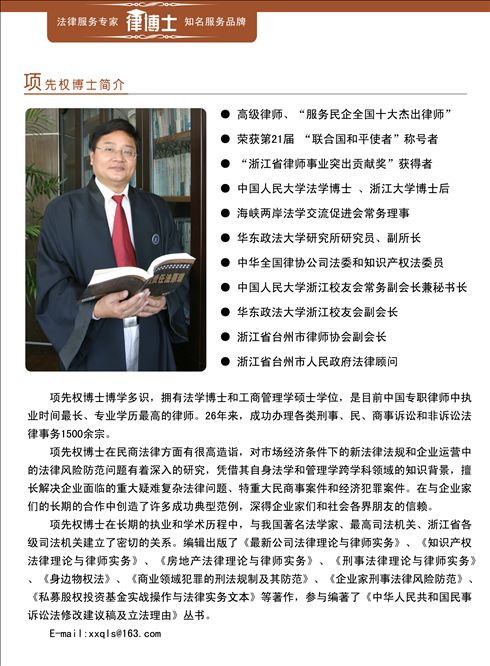浙江新臺(tái)州律師事務(wù)所成立于1998年,是一家大型綜合性法律服務(wù)機(jī)構(gòu)。以杭州為管理中心,在臺(tái)州、上海、北京設(shè)有分所或辦事機(jī)構(gòu),服務(wù)范圍輻射長(zhǎng)三角地區(qū)。 本所榮獲“浙江省省級(jí)優(yōu)秀律師事務(wù)所”、“服務(wù)民營(yíng)企業(yè)全國(guó)優(yōu)秀律師事務(wù)所”等榮譽(yù)稱號(hào)。主任項(xiàng)先權(quán)博士以其浙江大學(xué)工商管理碩士、中國(guó)人民大學(xué)法學(xué)博士、浙江大學(xué)博士后的教育背景及從業(yè)26年深厚的專業(yè)功力,在國(guó)內(nèi)法學(xué)界享有很高的聲望。他帶領(lǐng)專業(yè)法律服務(wù)團(tuán)隊(duì)取得了良好的業(yè)績(jī)與榮耀,獲得了社會(huì)的充分認(rèn)可與褒揚(yáng)。先后榮獲“浙江省律師事業(yè)突出貢獻(xiàn)獎(jiǎng)”、“服務(wù)民營(yíng)企業(yè)全國(guó)十大杰出律師”、“聯(lián)合國(guó)和平使者”等諸多榮譽(yù)稱號(hào)。 本所下設(shè):婚姻家庭法律部、刑事辯護(hù)法律部、訴訟仲裁部、公司證券事務(wù)部、知識(shí)產(chǎn)權(quán)事務(wù)部、建筑房地產(chǎn)事務(wù)部、企業(yè)法律顧問(wèn)部、律博士會(huì)員服務(wù)中心等專業(yè)服務(wù)部門。 感謝您對(duì)浙江新臺(tái)州律師事務(wù)所(杭州所)的支持與關(guān)心! 如有法律咨詢、業(yè)務(wù)委托或欲進(jìn)一步獲取有關(guān)信息,請(qǐng)與我們聯(lián)系: 杭州辦公地址 浙江省杭州市西湖區(qū)文三路369號(hào)文三數(shù)碼大廈12層1201室(浙江省檢察院與國(guó)土資源局中間) 郵編:310012 傳真:0571-88930756 聯(lián)系人:李律師 手機(jī):13656813663 辦公:0571-56883853 :676809687 群:杭州法律咨詢?nèi)海?26880116)、杭州律師咨詢?nèi)海?11658091) E-MAIL: LIYYLAWYER@163.COM 網(wǎng)址:://WWW.TZ-LAWYER.COM
