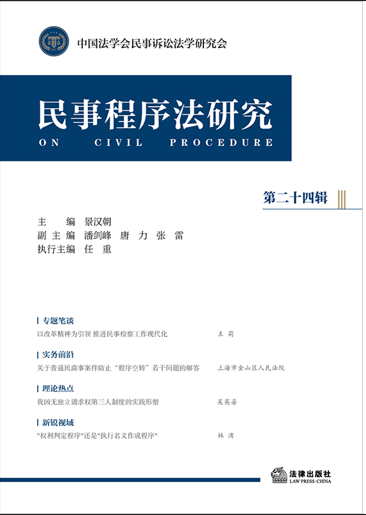 《民事程序法研究》(第二十四輯)分為專題筆談、實務(wù)前沿、理論熱點、新銳視域四個專題,收錄文章除對民事訴訟立法的熱點問題進(jìn)行多個視角的展開外,還涉及指定遺產(chǎn)管理、不方便法院等《民事訴訟法》修法問題,“程序空轉(zhuǎn)”、能動司法、異步訴訟等司法實踐重點問題,等等。